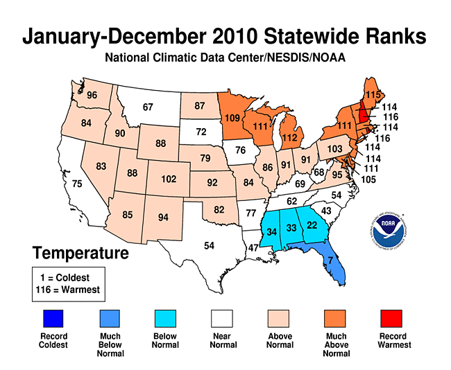 We have previously discussed, here, the data from NASA’s Goddard Institute of Space Studies showing that 2010 as the warmest climate year on record. We now have confirmation from the National Oceanic and Atmospheric Administration (NOAA). According to NOAA scientists, 2010 tied 2005 as the warmest year of the global surface temperature record, with record keeping beginning in 1880.