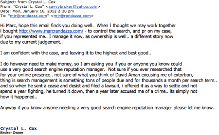 She offers her services to manage Randazza’s Google Footprint. The strategy is to set up numerous web sites with interconnecting links, and ensure that these web sites turn up first in any Google keyword searches. Ask Rick Santorum how that works. Apparently she offered the same service to David Aman – counsel for Kevin Padrick and Obsidian Finance – and he accused her of extortion.