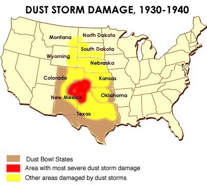 “The unusually wet period, which encouraged increased settlement and cultivation in the Great Plains, ended in 1930. This was the year in which an extended and severe drought began which caused crops to fail, leaving the plowed fields exposed to wind erosion. The fine soil of the Great Plains was easily eroded and carried east by strong continental winds.” http://en.wikipedia.org/wiki/Dust_Bowl .