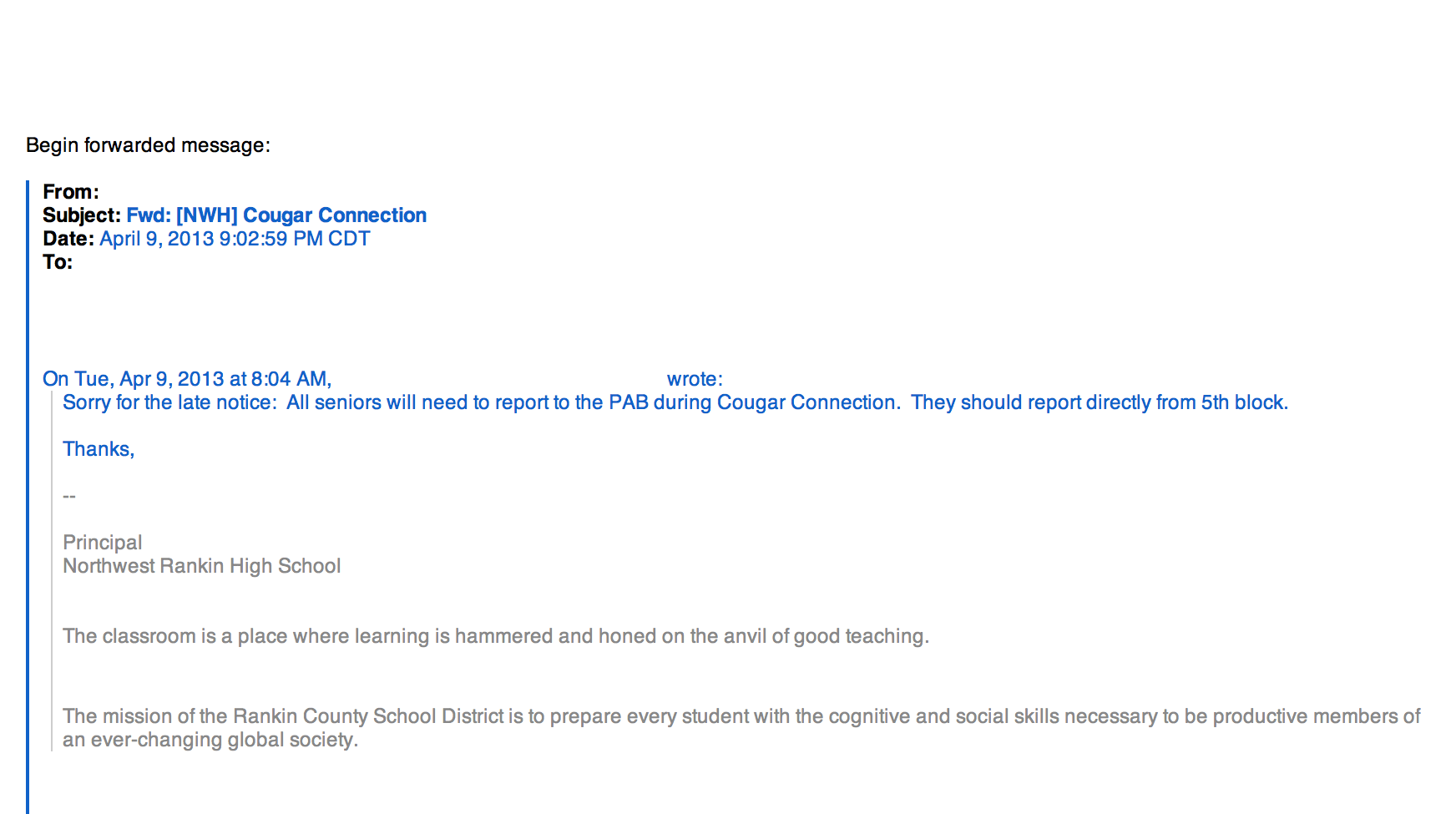 I think the principal figured that it was his ‘Christian duty” to try and stop the students who tried to leave and to let this assembly go on. An assembly like this belongs in some church, maybe aptly named the Assmebly Of G-d church, instead of the appropriately named northwest rankin high school, i.e. where the taxpayers are located who pay for the school and what goes on in it. (and sadly for the lawyers now because of this idiocy)
