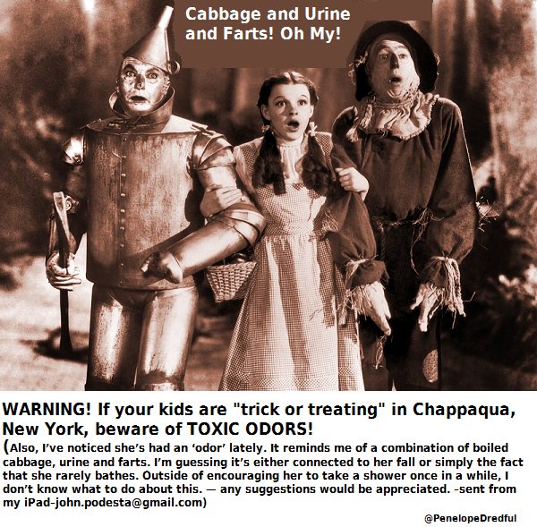 Squeek, I can smell the panic and fear. Hillary, sitting in her hotel room, “smelling like boiled cabbage, urine and farts” is sending out all her robots, even the ones who “are acting like a retard.” All those quotes are by John Podesta talking about the stinky candidate. LOVE Wikileaks!!